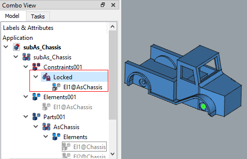 It is also possible for simple examples to select entities directly on the 3D view. These will automatically appear in the "Elements" group of the assembly container.