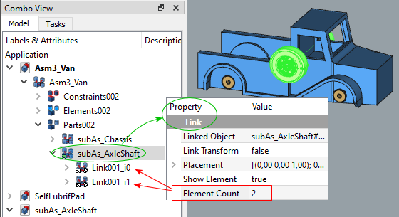 To do this, click in the tree structure on subAs_AxleShaft, then go to the Properties tab under the tree structure, in the Link part, and set Element Count to 2.